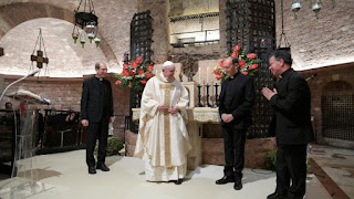 Nel viaggio verso Assisi il Papa ha fatto sosta presso il Monastero di Vallegloria a Spello, quindi giunto nella città di San Francesco ha compiuto una una breve sosta al Protomonastero di Santa Chiara per salutare le monache clarisse. Raggiunta poi la Basilica, che dal 1230 custodisce le spoglie del Santo umbro, il Pontefice è stato accolto dal custode del Sacro Convento di Assisi, padre Mauro Gambetti. Alla celebrazione eucaristica hanno partecipato anche una ventina di frati, alcune religiose, assieme al vescovo della diocesi, Domenico Sorrentino, e al cardinale Agostino Vallini, legato pontificio per le basiliche di San Francesco e di Santa Maria degli Angeli in Assisi. È la quarta volta che Papa Francesco si reca ad Assisi.